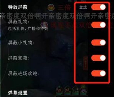 点击眼睛图标后,会弹出一个屏蔽选项列表。在这个列表中,您需要找到与礼物特效相关的选项,比如“屏蔽宝箱”、“屏蔽小礼物”、“屏蔽动画特效”等,并依次点击它们进行关闭。