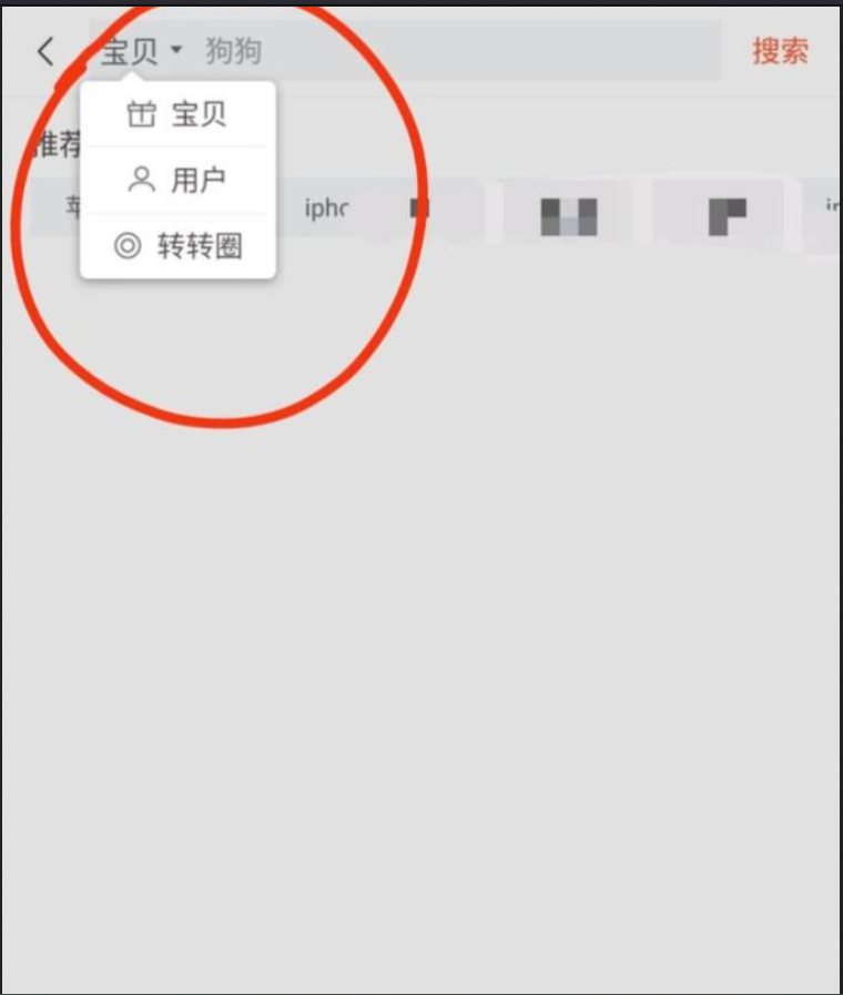 3、进入搜索栏之后,可以看到搜索栏边上有“宝贝”二字,点击“宝贝”,会出现如下选项。