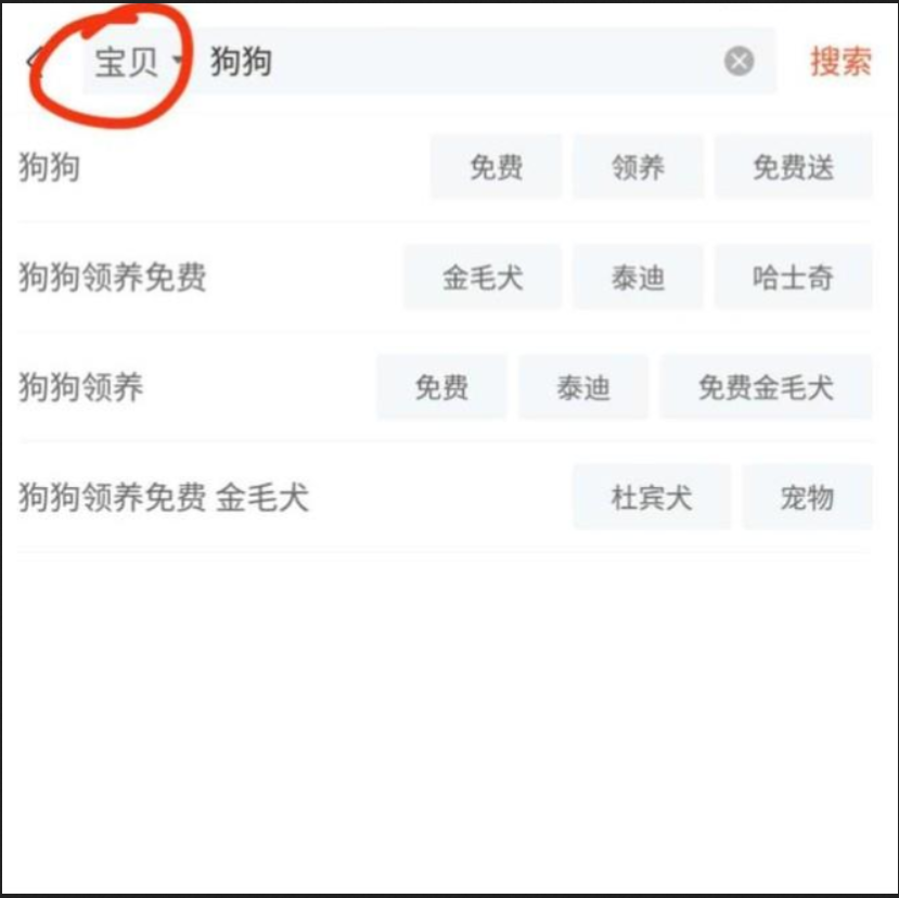 5、或者在搜索栏点击“宝贝”,可以看到所有和该宝贝有关的东西,比如你输入狗,就会出现所有售卖的狗狗。