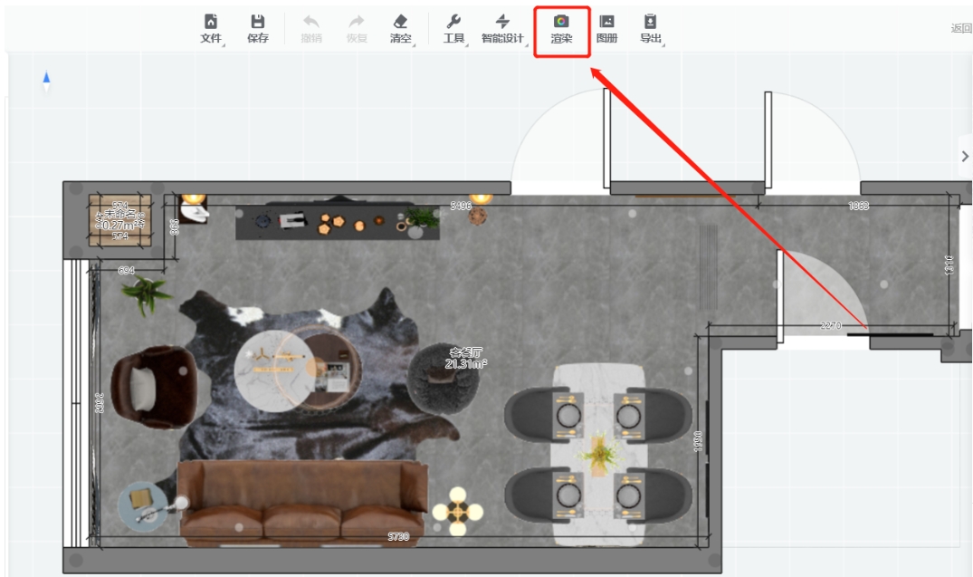 2、在室内设计装修方案界面中,找到界面最上方工具栏上的“渲染”功能,并点击。