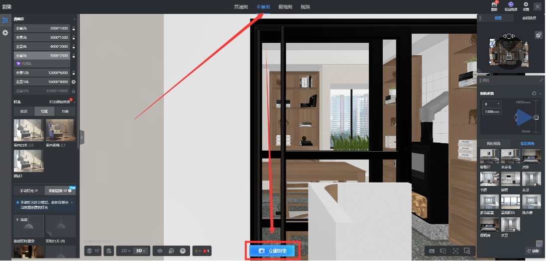 3、进入效果图的渲染界面后,选择“全景图”,然后对灯光、外景等参数进行设置,以满足自己的需求。所有设置完成后,点击界面下方的“立即渲染”按钮,就可以进行VR全景效果图的渲染了。