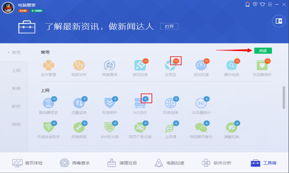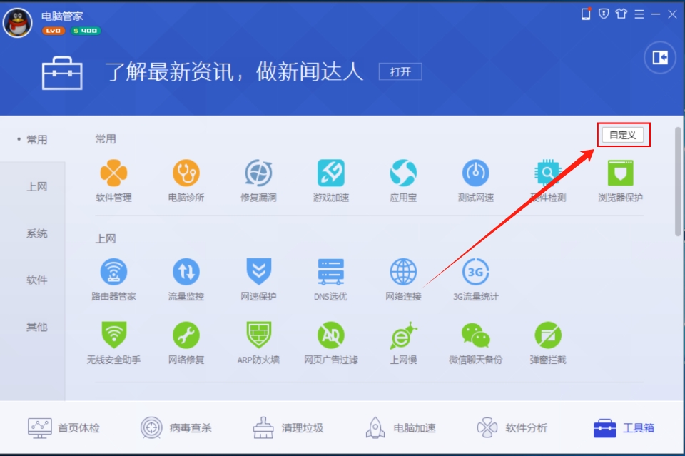 电脑管家怎样自定义常用工具?