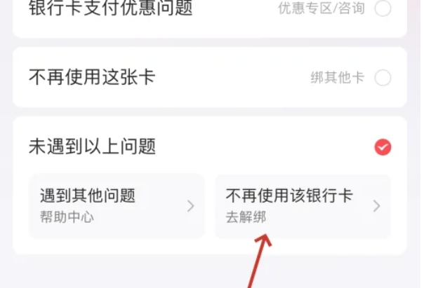 会弹出一个提示框,询问您是否“未遇到以上问题”,点击该选项。接着,您会看到一个展开的菜单,选择“不再使用该银行卡”选项。