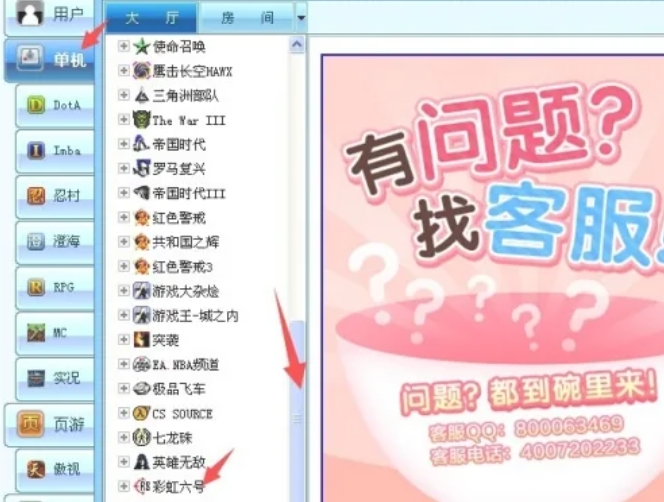 “单机”区域中,你会看到一系列的游戏选项,需要向下滚动滑块来找到“彩虹六号”。注意,虽然这里写的是“彩虹六号”,但实际上是流星蝴蝶剑的联机房间。