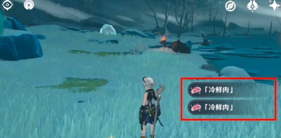 最后,使用火元素攻击融化冰块并击杀野猪,点击拾取即可获得食物“冷鲜肉”。