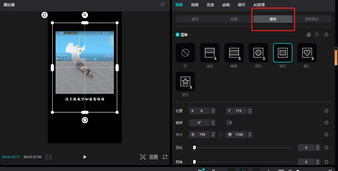 方法三:添加蒙版,并给蒙版添加模糊效果,使蒙版更自然导入视频,并将视频拖放到时间线上。复制一份原素材,放在上层。点击工具栏里的矩形蒙版,将矩形蒙版放置在有水印的地方。接着再点击特效里的模糊效果,使水印部分变得模糊。