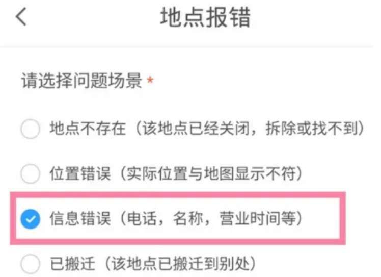 在地点报错页面中,你可以通过搜索框输入需要更改的店铺名称或相关关键词,以找到对应的地点。在搜索结果中找到目标地点后,勾选“信息错误”或其他相关的错误选项,以表明你需要修改该地点的信息。