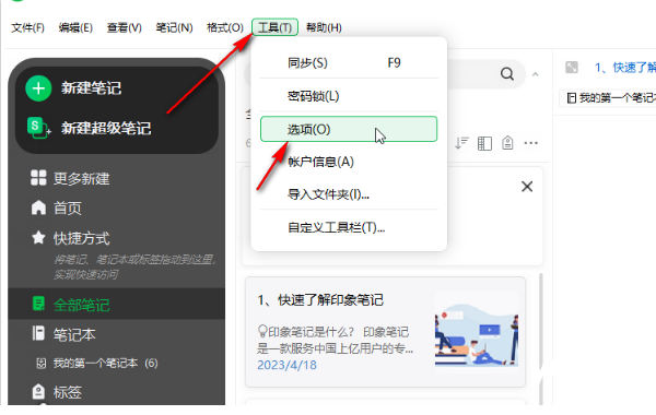 1、打开印象笔记,在主界面左上角找到【工具】一栏,点击后在列表选项这种选择【选项】;