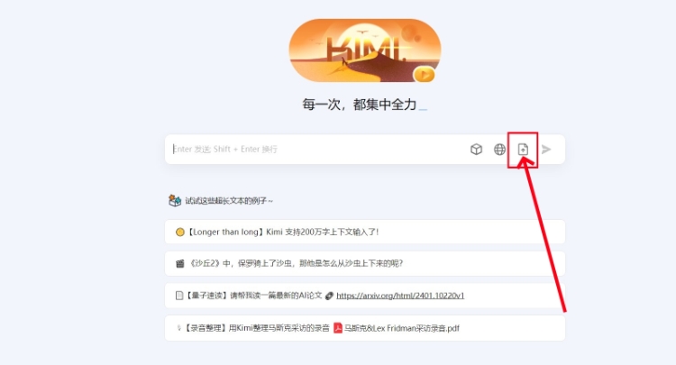 1、在Kimi的网页界面中,点击文件上传的图标。