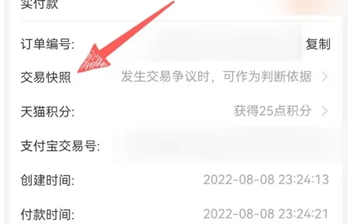 在订单详情页面中,找到并点击“交易快照”选项。这通常位于订单信息的下方或“更多操作”选项中。