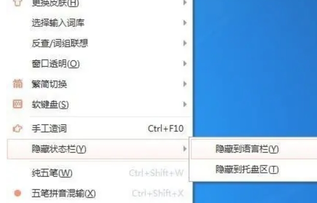在隐藏状态栏的选项下,选择“隐藏到语言区”选项就可以将状态栏隐藏到系统的语言栏区域。