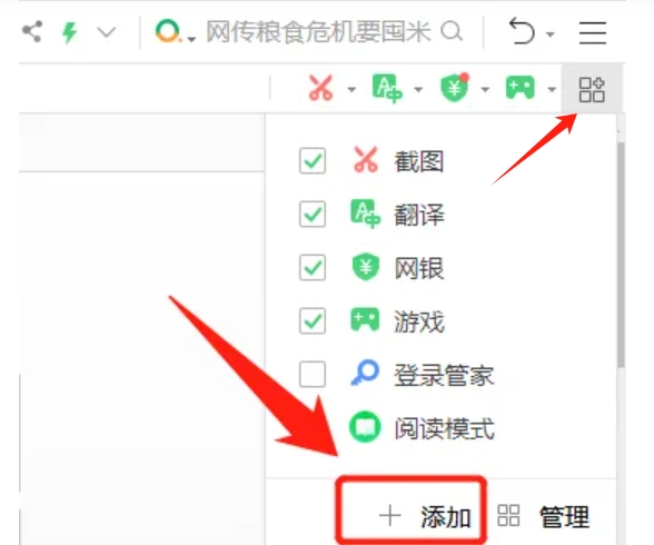 在浏览器右上角,找到并点击插件管理按钮(四个小方块组成的图标),在弹出的选项菜单中,选择“+”添加选项,以进入扩展管理界面。