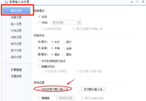 在设置界面中,找到“基本设置”或类似选项,并确保“锁定百度为默认输入法”的勾选框被选中。你也可以在设置界面中寻找并点击“设为默认输入法”的按钮,以直接设置百度输入法为默认输入法。