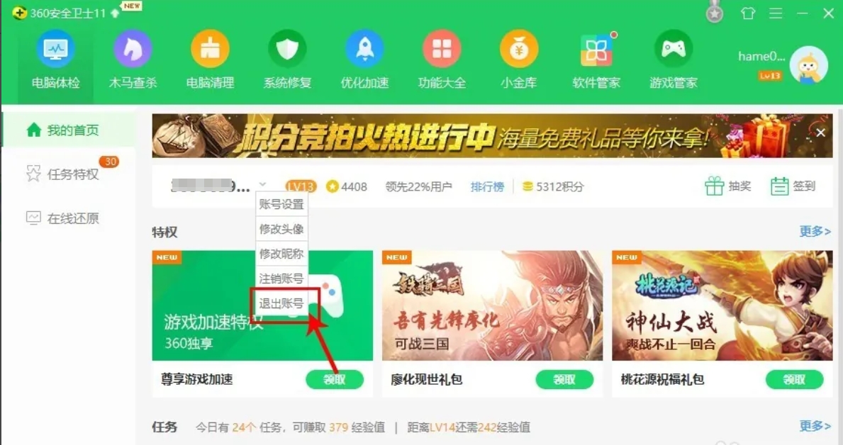 360安全卫士怎么退出登录?