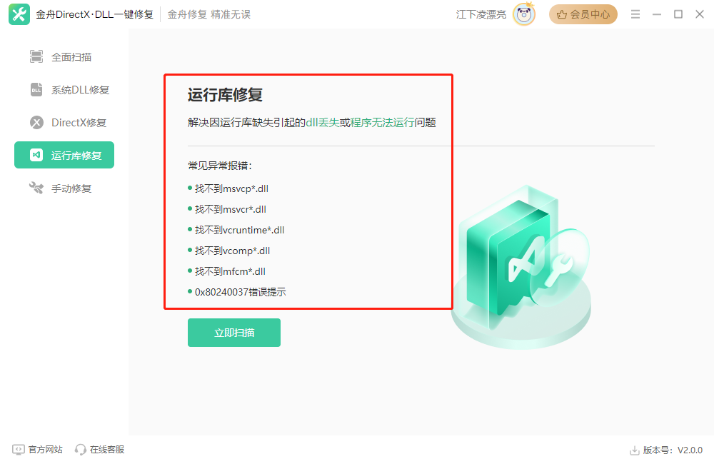 选择运行库修复,可解决因运行库确实引起的dll丢失或程序无法运行的问题;常见的异常报错包括找不到msvcp*.dll、找不到msvcr*.dll、找不到vcruntime*.dll等