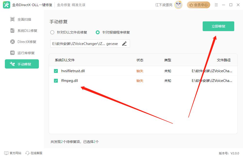 Step4、扫描结果出来,丢失的是以下两个DLL文件,此时点击「立即修复」就可以了;