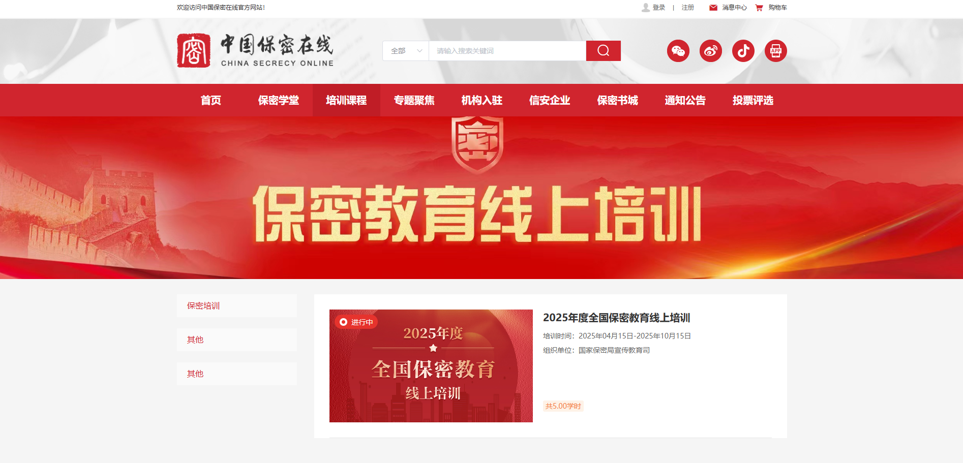进入培训系统:点击首页标题图 “全国保密教育线上培训”,或通过导航栏 “培训入口” 进入。