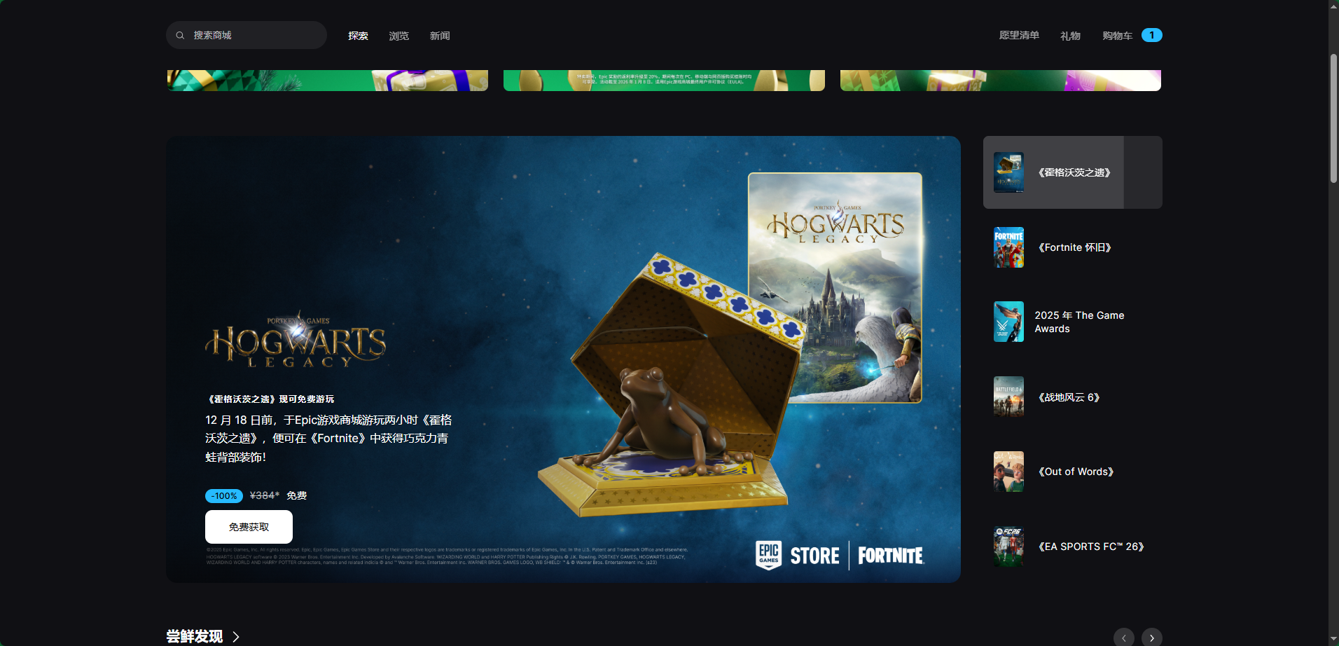 打开Epic Games客户端(PC端)→ 点击首页“免费游戏”板块。