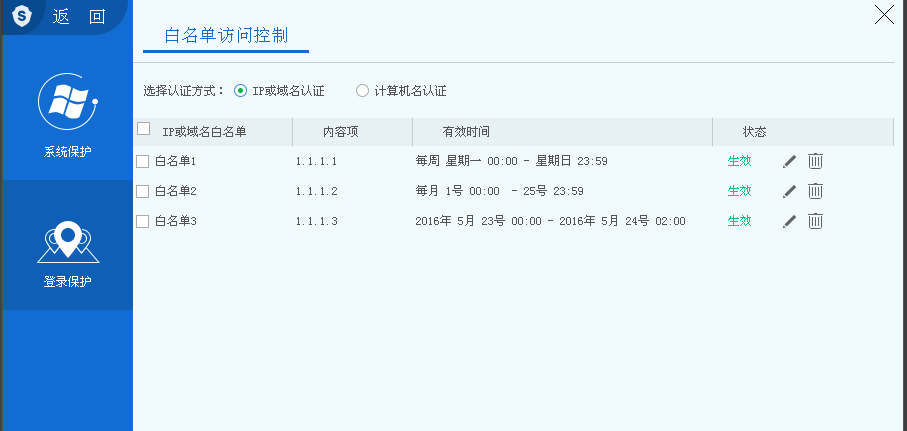 3、然后在点击登录保护后的设置选项,打开白名单访问控制界面,您需要选择认证的方式“IP域名认证”或“计算机名认证”,选择完成后,点击右下角的【添加】按钮。