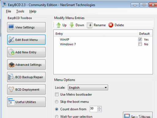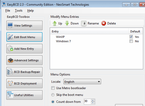 您可以从“编辑引导菜单”页面轻松设置EasyBCD中的默认条目。