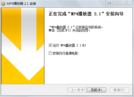 5、安装结束后,会自动跳转至安装完成界面。如果需要立即使用MP4视频播放器的话,则勾选“运行 MP4播放器 2.1”选项;如果需要风行高清电影软件的话,则勾选“安装风行高清电影”选项。最后点击“完成”即可。