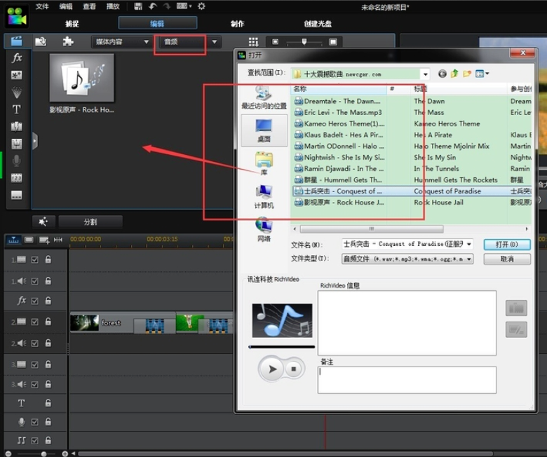 3、点击威力导演(PowerDirector)顶部的【音频】,导入您要添加为音乐文件。
