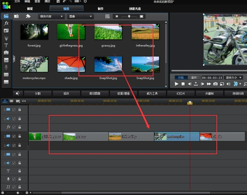 1、打开在本站下载的威力导演软件,打开软件后,导入您要操作的图片,将图片拖到时间轴上。