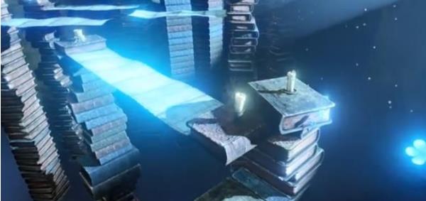 我们来到了一个书的海洋,这里的书在发蓝光的时候是会伸展开来,颜色暗下去的时候书页就会落下,所以后面一定要小心。